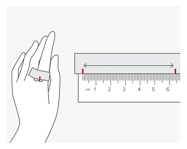 Mark where the strip overlaps, then measure its length in millimetres (mm) with a ruler. This is your finger’s circumference.